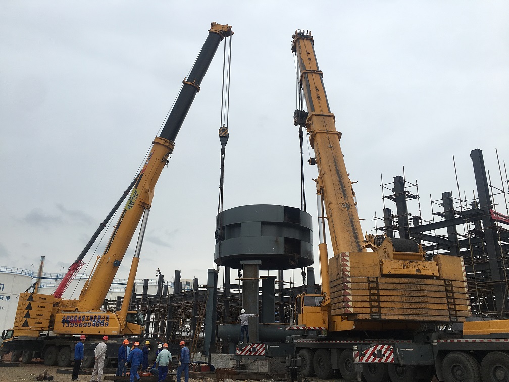 本次吊裝的反應(yīng)器中段部分重達(dá)220噸,分公司領(lǐng)導(dǎo)高度重視,吊裝前期,邀請(qǐng)公司總工吳繼成、總工辦主任牛守義和安全部王岳濤經(jīng)理親臨項(xiàng)目部參與設(shè)備吊裝的專題方案討論定稿工作。當(dāng)日上午,吊裝現(xiàn)場(chǎng)準(zhǔn)備工作緊張卻又有條不紊的進(jìn)行,項(xiàng)目經(jīng)理李子鳳向全體“參戰(zhàn)”員工進(jìn)行了安全交底,工作人員對(duì)兩臺(tái)分別為500T、350T吊車(chē)的站位及性能再次確認(rèn),現(xiàn)場(chǎng)機(jī)具、人員均按既定方案實(shí)施。分公司經(jīng)理史崇松、業(yè)主單位負(fù)責(zé)人、監(jiān)理全程在現(xiàn)場(chǎng)“督戰(zhàn)”,全體工作人員經(jīng)過(guò)四個(gè)小時(shí)的奮戰(zhàn),吊裝作業(yè)圓滿結(jié)束。