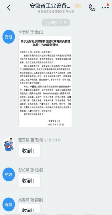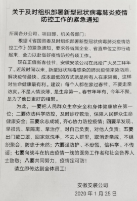 二是部署到位。疫情防控工作開展后,1月25日(大年初一)安徽安裝公司發(fā)出防控疫情工作的緊急通知,1月27日制定肺炎疫情防控措施,對疫情防控工作進(jìn)行細(xì)化安排,周密部署。要求各分公司、直屬項目部、各部門要以對職工群眾生命安全高度負(fù)責(zé)的態(tài)度,精準(zhǔn)施策,堅決遏制疫情在安徽安裝公司輸入、蔓延,鼓勵職工戴口罩、勤洗手、多通風(fēng)、少走動、常消毒。