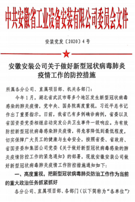 疫情就是命令,防控就是責(zé)任。新型冠狀病毒感染肺炎疫情防控工作開展以來,安徽安裝公司始終堅持職工群眾生命安全和身體健康是第一位的原則,將疫情防控作為當(dāng)前最重要的工作來抓,五項舉措到位,群防群治、聯(lián)防聯(lián)控、堅定信心、科學(xué)防治,堅決打贏這場疫情防控戰(zhàn)。