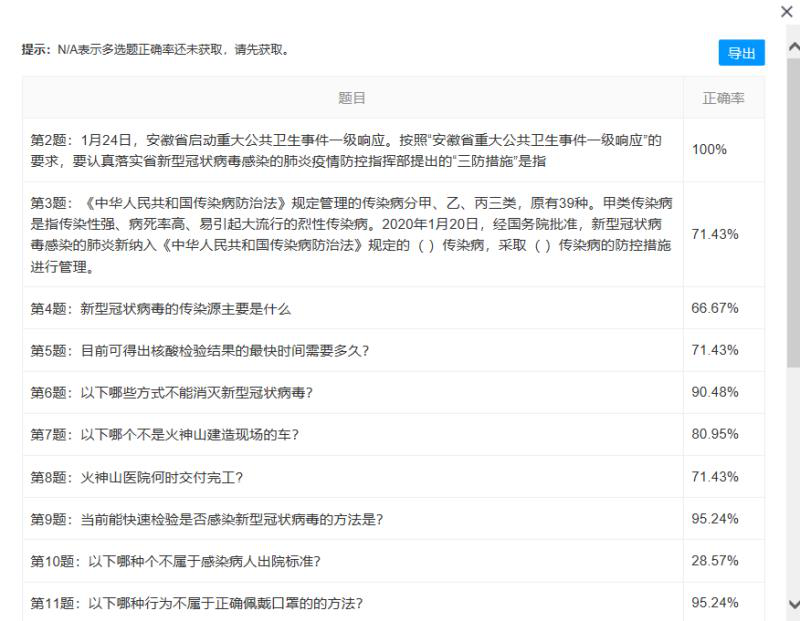本次疫情防控知識答題通過在分公司微信群發(fā)送答題鏈接開展,內(nèi)容涵蓋新冠肺炎基本知識、疫情防控措施、員工居家防控等多項內(nèi)容,同時還對上級在疫情期間下發(fā)的各類疫情防控工作指導(dǎo)意見、措施等進行了宣貫。此次活動,員工參與率達到了100%,不僅加強了員工對防疫知識的了解,還提高了預(yù)防疾病自我保護的意識,防疫知識掌握情況總體較好。通過參與答題,廣大員工進一步了解了新冠肺炎的傳播途徑及相關(guān)防護措施,表示要努力做到認真理性對待疫情,保持良好個人生活習(xí)慣和公共衛(wèi)生習(xí)慣,遵守疫情防控工作要求,胸懷全局、統(tǒng)一思想,堅決打贏疫情防控阻擊戰(zhàn)。