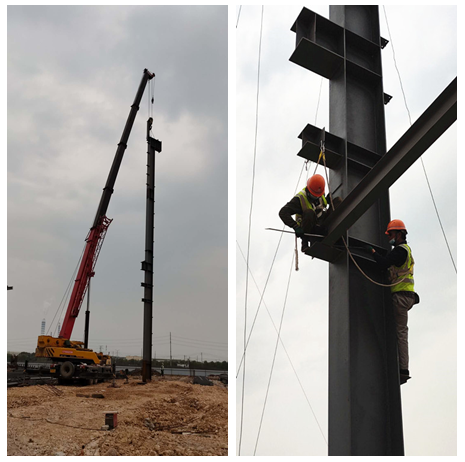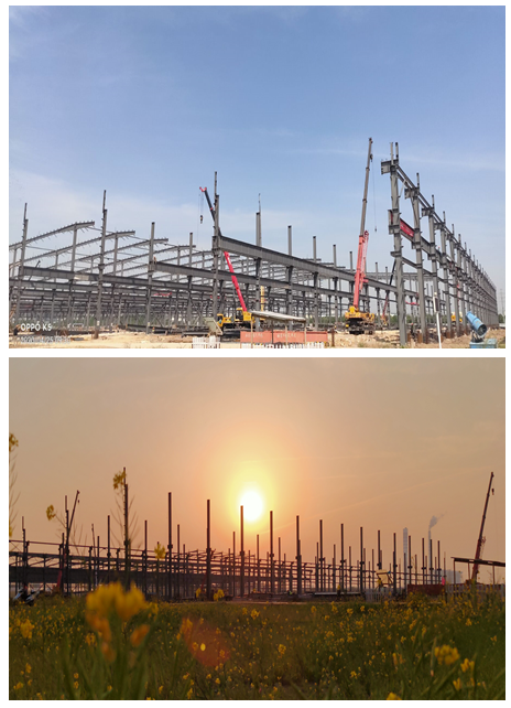 為進(jìn)一步調(diào)動(dòng)參建人員的積極性和創(chuàng)造性,分公司組織開展項(xiàng)目“大干90天”勞動(dòng)競(jìng)賽,有效形成了一片“比、學(xué)、趕、幫、超”的火熱生產(chǎn)局面。盡管3月底持續(xù)陰雨天氣,但絲毫沒有影響到月施工進(jìn)度,2#車間整體框架已全部按時(shí)間節(jié)點(diǎn)圓滿完成。目前,1#車間安裝正在高速推進(jìn)。