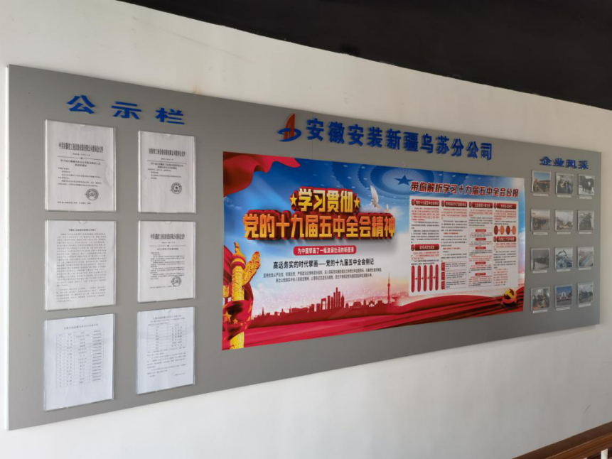 走進(jìn)安徽安裝公司新疆烏蘇分公司辦公區(qū),一塊紅色的黨建公開欄首先映入眼簾。公開欄還包括黨員風(fēng)采、公示欄、黨務(wù)公開、光榮榜等板塊,成為分公司一處醒目的景觀。