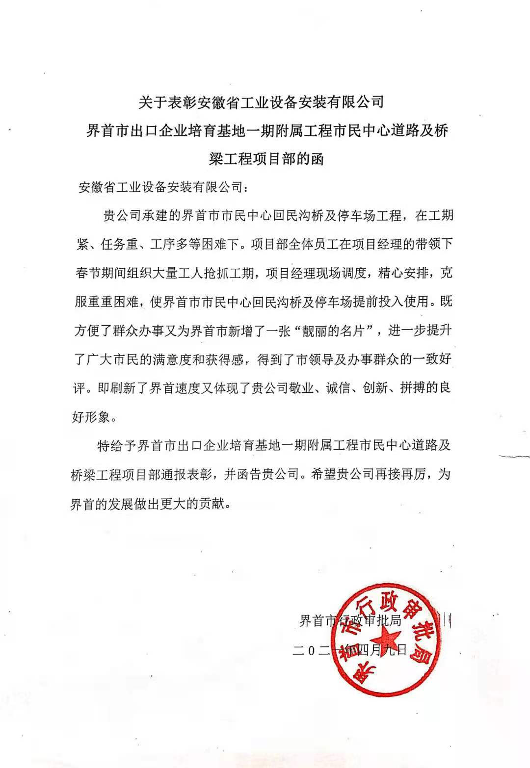 近日,界首市行政審批局發(fā)來通報函,就合肥分公司界首市出口企業(yè)培育基地一期附屬工程市民中心道路及橋梁工程項目部在工程施工中的突出表現(xiàn)給予通報表彰!