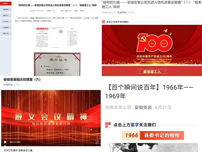 公司黨委第一時(shí)間編印專(zhuān)刊宣傳板報(bào)下發(fā)至所屬各單位和基層項(xiàng)目一線,用好企業(yè)網(wǎng)站、微信公眾號(hào)、電子屏、宣傳欄和所屬各單位、各項(xiàng)目部所有宣傳陣地,在公司網(wǎng)站、微信公眾號(hào)先后開(kāi)設(shè)“百個(gè)瞬間說(shuō)百年”“黨史學(xué)習(xí)教育專(zhuān)欄系列報(bào)道”“榜樣的力量——安徽安裝公司先進(jìn)人物先進(jìn)事跡展播”“記錄奮進(jìn)力量—安徽安裝公司基層一線事跡展播”等專(zhuān)欄進(jìn)行專(zhuān)題宣傳,大力營(yíng)造“學(xué)習(xí)黨史有熱情,干事創(chuàng)業(yè)有激情”的良好氛圍,合肥分公司黨支部舉辦黨史學(xué)習(xí)教育主題攝影大賽,努力營(yíng)造悟初心、守初心、踐初心的強(qiáng)大聲勢(shì)。