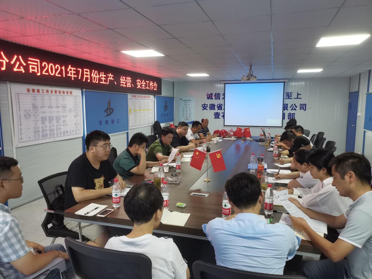 7月31日,房建(裝飾)分公司在定遠壹石通化學科技廠房項目部召開7月生產(chǎn)、安全、經(jīng)營工作會議,分公司領導班子成員、所屬各項目班子成員、分公司機關各部門負責人以及工程部全體成員參加會議,會議由分公司副經(jīng)理徐明東主持。