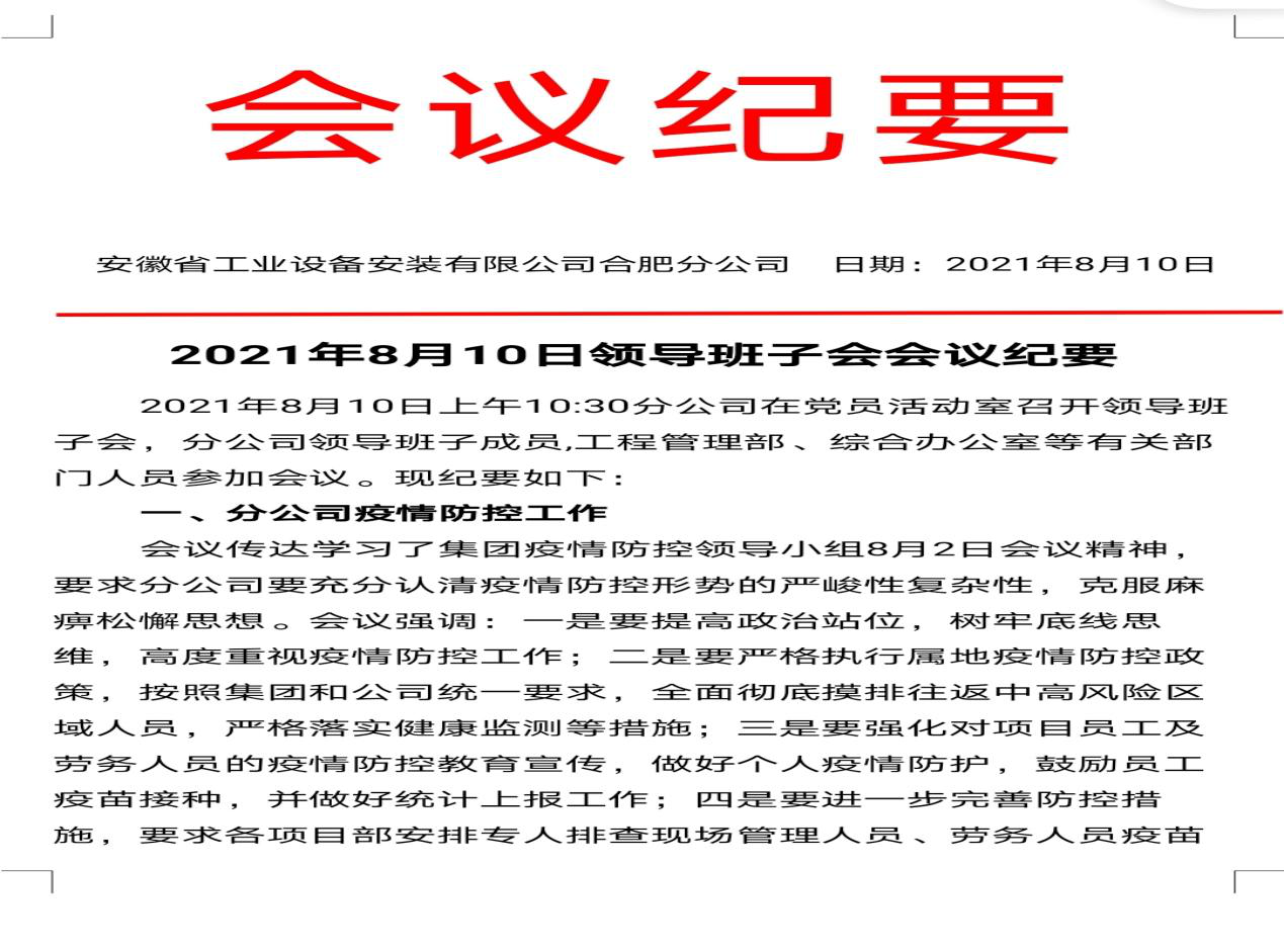 分公司所屬在建項(xiàng)目部也在積極推進(jìn)疫情防控各項(xiàng)工作,靈璧項(xiàng)目部召開疫情防控部署會(huì)議,專題部署項(xiàng)目開展疫情防控工作;新宇藥業(yè)項(xiàng)目積極響應(yīng)宿州市政府及公司相關(guān)防疫要求,成立項(xiàng)目部疫情防控領(lǐng)導(dǎo)小組,設(shè)立防疫檢測(cè)點(diǎn)和隔離室,對(duì)每日進(jìn)出場(chǎng)地人員進(jìn)行體溫登記和安康碼及行程監(jiān)測(cè)。