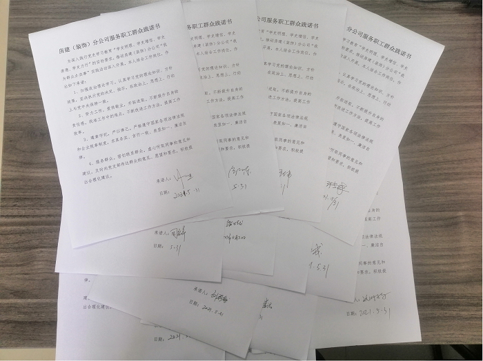 會議最后,所有與會人員簽訂了《房建(裝飾)分公司服務(wù)職工群眾踐諾書》,布置下發(fā)了《黨史、新中國史、改革開放史、社會主義發(fā)展史知識測試題匯編》。