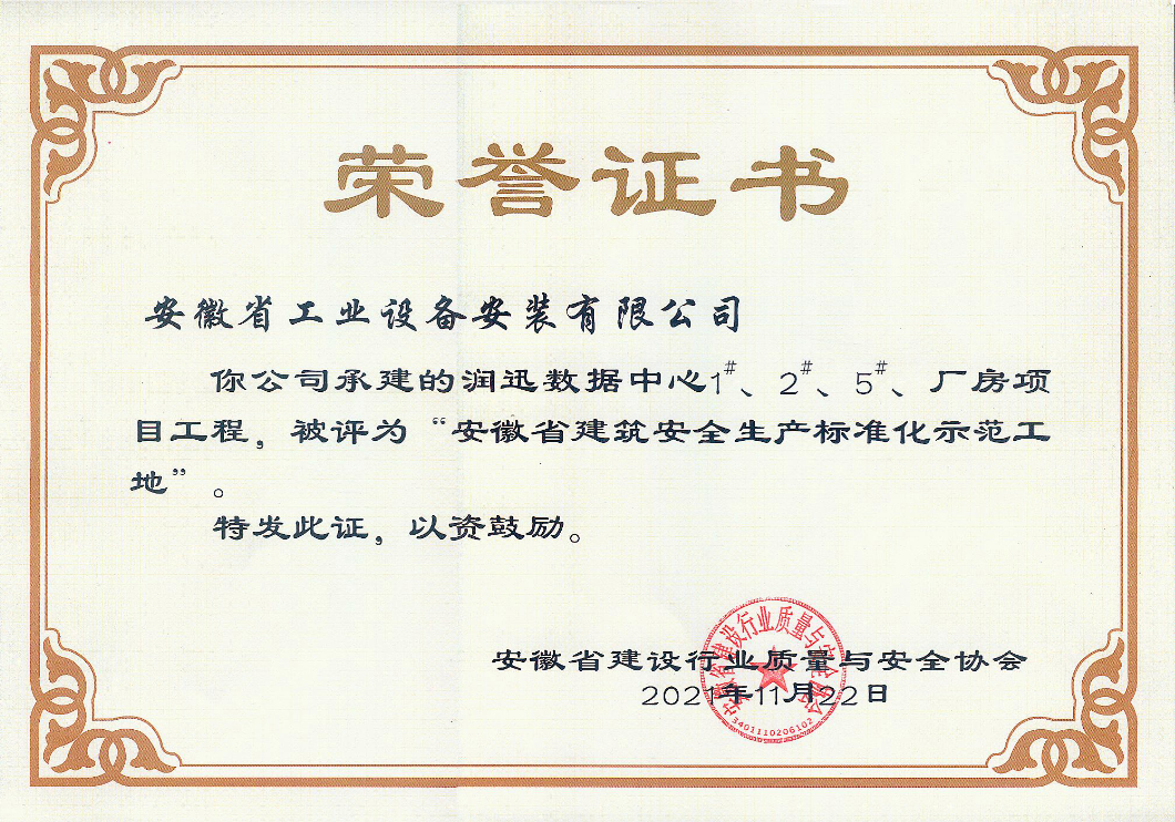 近日,安徽省工業(yè)設(shè)備安裝有限公司承建的潤迅數(shù)據(jù)中心1#、2#、5#廠房項目工程榮獲2021年度“安徽省建筑安全生產(chǎn)標(biāo)準(zhǔn)化示范工地”榮譽稱號。