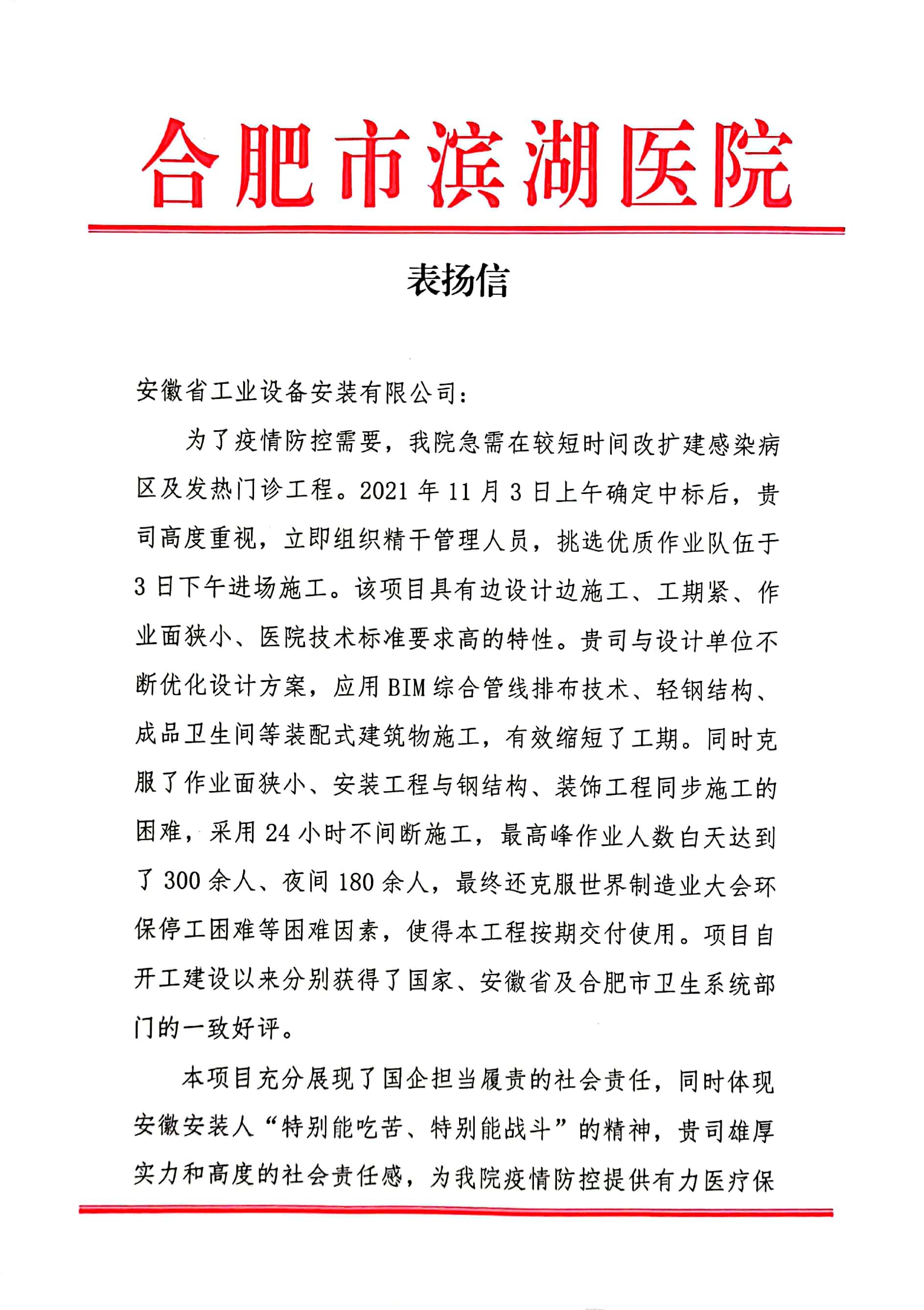 近日,安徽安裝公司收到合肥市濱湖醫(yī)院表揚(yáng)信,信中高度贊揚(yáng)公司濱湖醫(yī)院感染病區(qū)及發(fā)熱門診應(yīng)急改造工程設(shè)計(jì)施工一體化方艙醫(yī)院項(xiàng)目克服重重困難,縮短工期,一個(gè)月的時(shí)間內(nèi)按期交付使用。該項(xiàng)目充分展現(xiàn)了安徽安裝作為國有企業(yè)擔(dān)當(dāng)履責(zé)的社會(huì)責(zé)任,為合肥市打贏防疫攻堅(jiān)戰(zhàn)奠定了堅(jiān)實(shí)基礎(chǔ)。