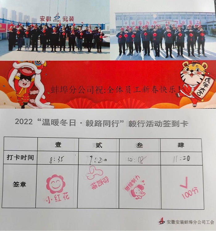 為展示安徽安裝蚌埠分公司員工積極向上的精神風(fēng)貌,倡導(dǎo)健康環(huán)保的生活理念,1月20日上午,分公司工會(huì)舉辦了一場主題為“溫暖冬日 毅路同行”的徒步毅行活動(dòng),分公司50余名員工參加活動(dòng)。