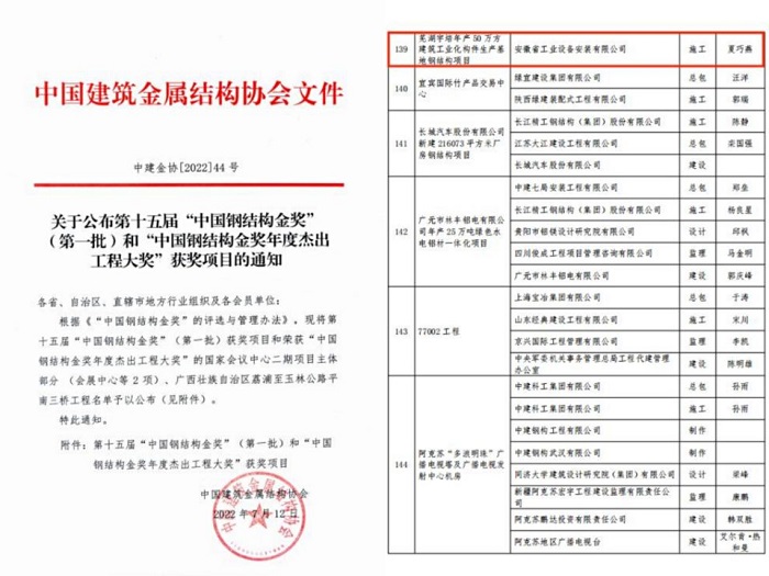 7月12日,中國建筑金屬結(jié)構(gòu)協(xié)會公布第十五屆“中國鋼結(jié)構(gòu)金獎”(第一批)獲獎項目。由安徽安裝公司承建的蕪湖宇培年產(chǎn)50萬方建筑工業(yè)化構(gòu)件生產(chǎn)基地鋼結(jié)構(gòu)項目獲此殊榮。