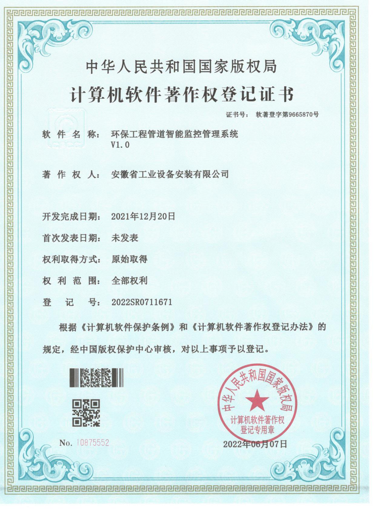 近日,經國家版權局審核批準,安徽安裝公司申報的《環(huán)保工程管道智能監(jiān)控管理系統(tǒng)V1.0》喜獲計算機軟件著作權登記證書,這標志著公司在數(shù)字與信息化發(fā)展上實現(xiàn)新突破、邁上新臺階,開啟了數(shù)字化轉型新征程。