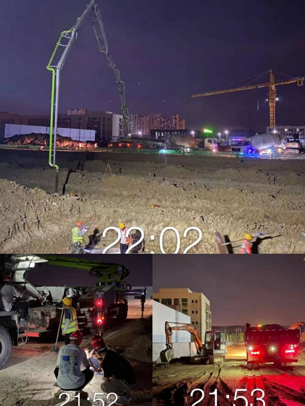 圖為夜間肥西安信立士項目1#樓基礎墊層混凝土澆筑及基礎開挖施工現(xiàn)場