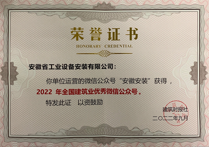 喜訊!安徽安裝微信公眾號(hào)榮獲“2022年全國(guó)建筑業(yè)優(yōu)秀微信公眾號(hào)”榮譽(yù)稱(chēng)號(hào)