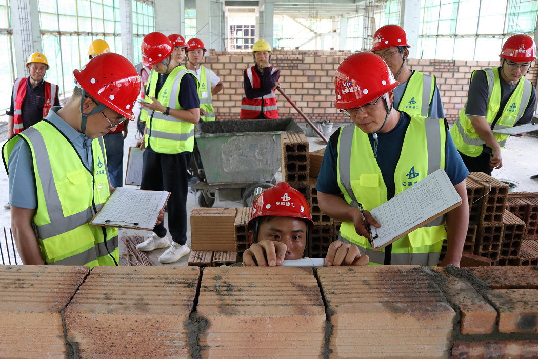 此次技能大賽選在阜南一小項目施工現(xiàn)場實際作業(yè)面進行比賽,即避免了砌筑抹灰成品的浪費,真正將技能競賽做實做細,又大大提升了全員的施工質(zhì)量意識,達到了提升勞務(wù)隊伍專業(yè)技能,弘揚工匠精神,以賽促效、以賽促建的目的,整個比賽時限為2個小時。最終,評委組通過“看、摸、敲、照、靠、量、吊、套”,從完成度、觀感質(zhì)量、垂直度、平整度及文明施工等規(guī)范要求方面進行現(xiàn)場綜合打分,并分別評選出一、二等獲獎和優(yōu)勝參賽隊。
