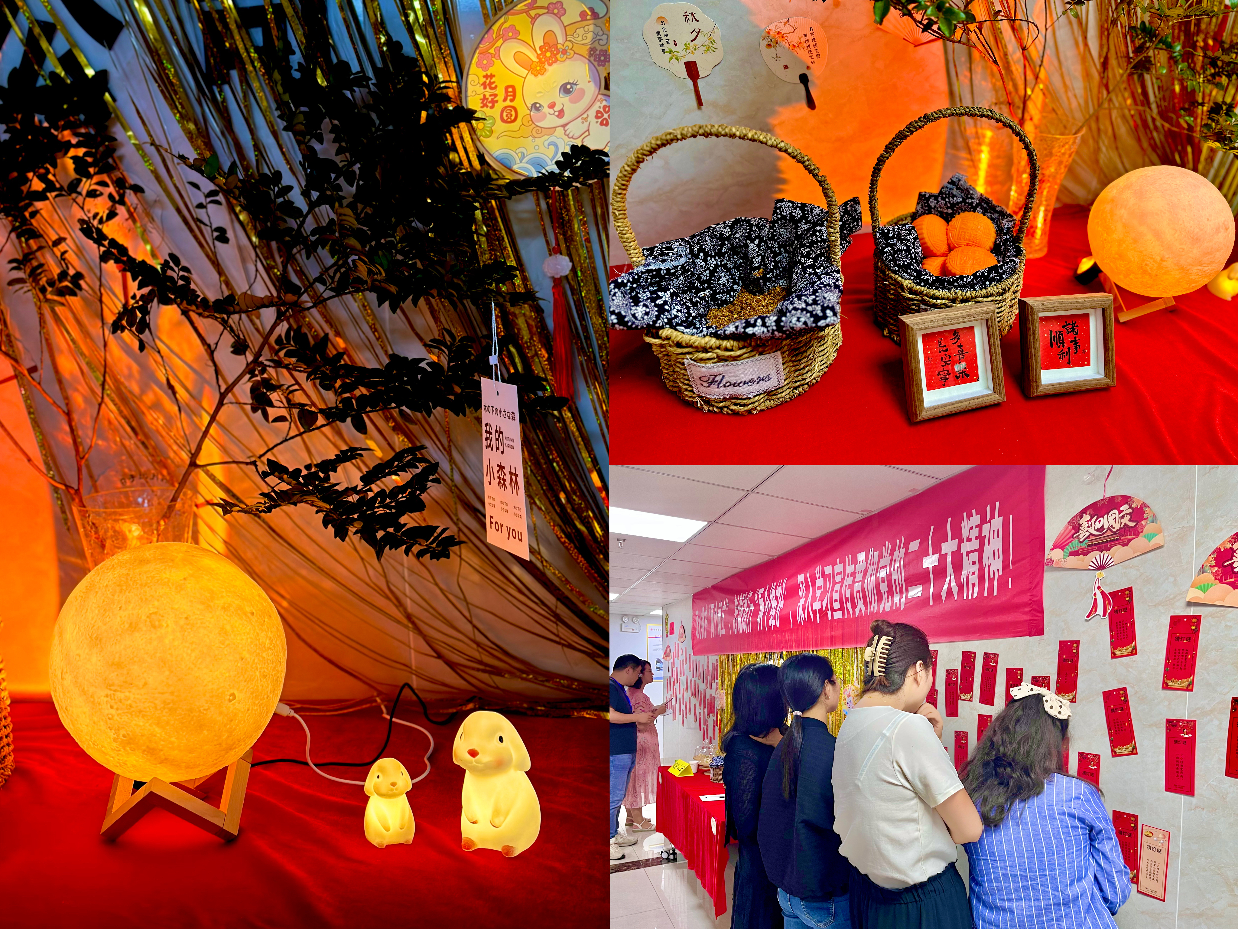 分公司工會購置月亮燈、玉桂兔、綠植、桂花籃、燈籠、貼畫等各種裝飾物,把整個分公司裝扮得喜慶又熱鬧,擺放各式月餅、綠豆糕等供大家品嘗。舉辦“猜燈謎”小游戲,在分公司背景墻貼上“燈謎”小卡片,大家紛紛駐足觀賞、熱情參與,節(jié)日氣氛值瞬間拉滿。