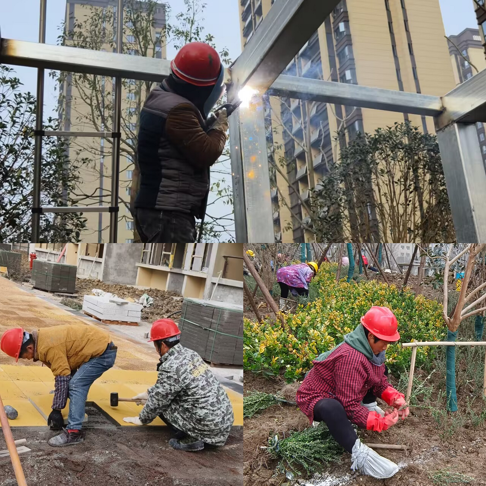 圖為:舒城縣青墩小區(qū)項目坡道鋼結構雨棚焊接、人行道鋪裝及綠化種植施工