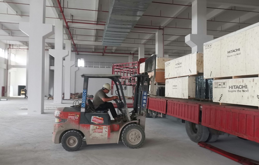 臨港科創(chuàng)園項(xiàng)目現(xiàn)場安裝人員正在進(jìn)行電梯卸貨