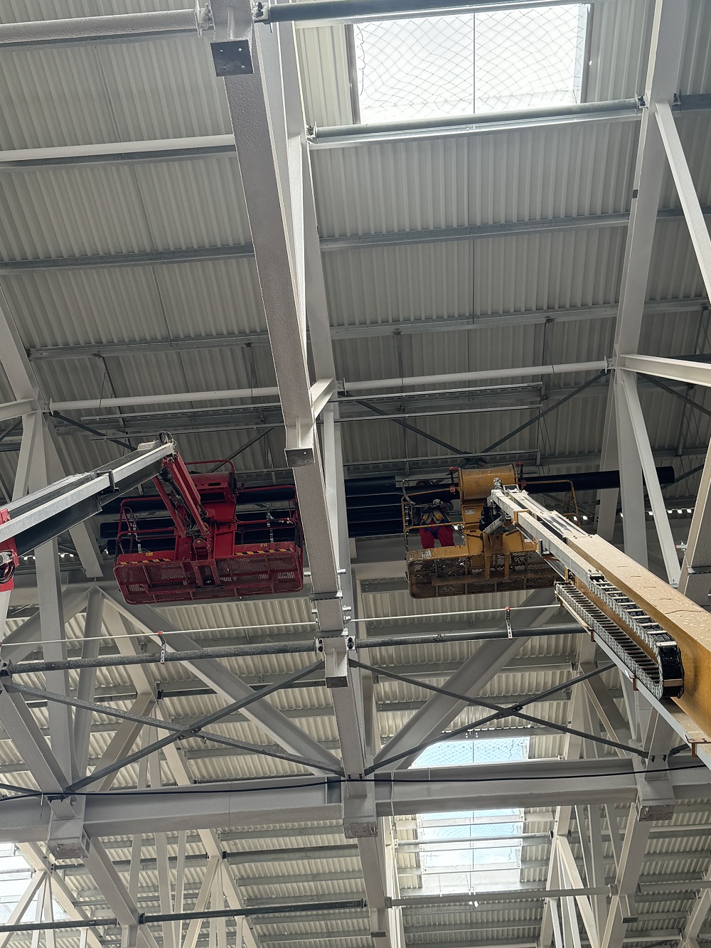 目前正在進行車間一1-6區(qū)通風管、照明管、橋架、虹吸雨水管、衛(wèi)生間排水管、防雷接地、消防管等安裝作業(yè),材料加工區(qū)預制各類管道支架也在同步推進。現已完成車間一風管安裝約3000平方米,風管預制約8000平方米,虹吸雨水管道安裝約120米,照明配管安裝約2000米,消防管道安裝約320米,防雷接地網安裝約10000米,橋架安裝約400米。