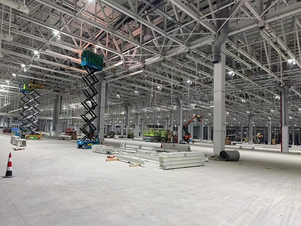 截至目前,車間一B區(qū)焊裝車間內的給排水管道、消防管道、暖通風管、空調水管、虹吸雨水、630循環(huán)水管均全部安裝完成,已全面進入試壓階段。正在進行車間一沖壓車間及QA樓安裝工作,電氣系統(tǒng)進入電纜放線安裝階段,暖通系統(tǒng)進入風口風閥安裝階段。