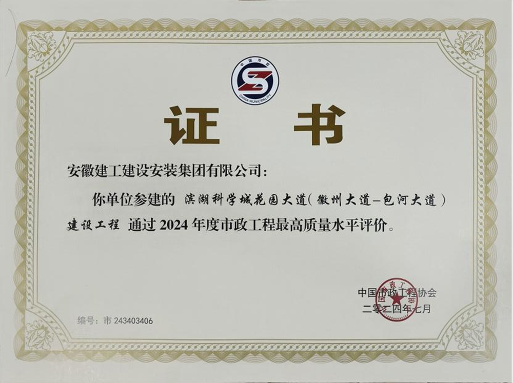 近日,中國市政工程協(xié)會頒發(fā)了2024年度市政工程最高質(zhì)量水平評價獎證書,建工安裝合肥分公司濱湖科學(xué)城花園大道(徽州大道-包河大道)建設(shè)工程項目榮獲市政工程最高質(zhì)量水平評價獎,這是本項目繼榮獲“華東優(yōu)質(zhì)安裝工程獎”、“黃山杯”之后的又一國家級獎項。