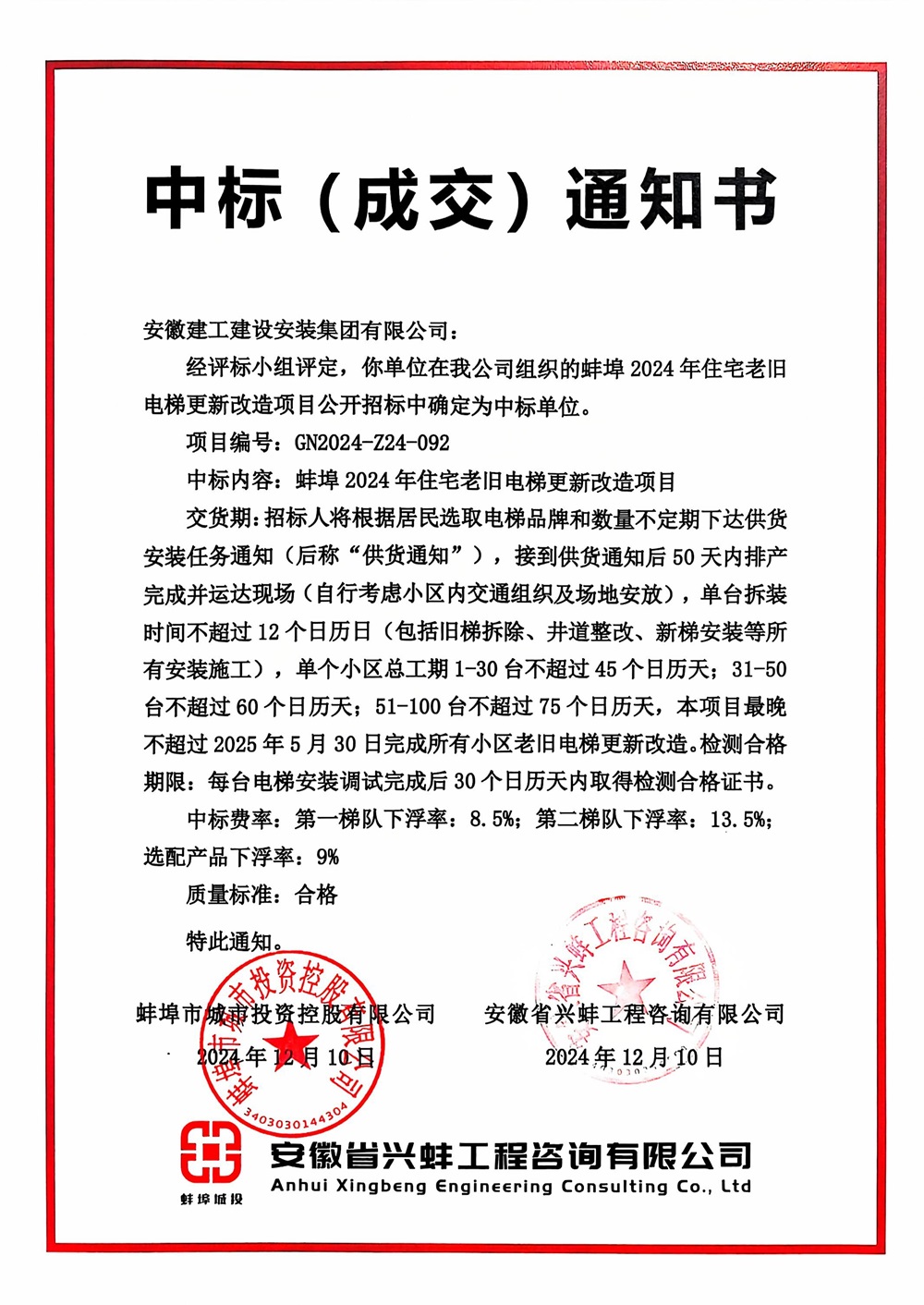 12月10日,建工安裝電梯分公司成功收到蚌埠2024年住宅老舊電梯更新改造項目中標(biāo)通知書!