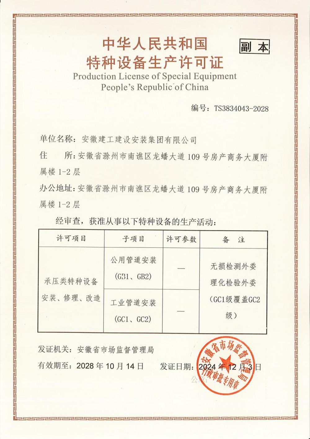 近日,建工安裝“承壓類特種設(shè)備安裝、修理、改造—壓力管道(GB1、GB2)、(GC1、GC2)”延續(xù)換證工作順利通過(guò)中國(guó)工業(yè)氣體工業(yè)協(xié)會(huì)、安徽省特種設(shè)備檢測(cè)院等各方的評(píng)審核查,現(xiàn)已取得安徽省市場(chǎng)監(jiān)督管理局頒發(fā)的新證,為公司相關(guān)業(yè)務(wù)的開展奠定了良好基礎(chǔ)。