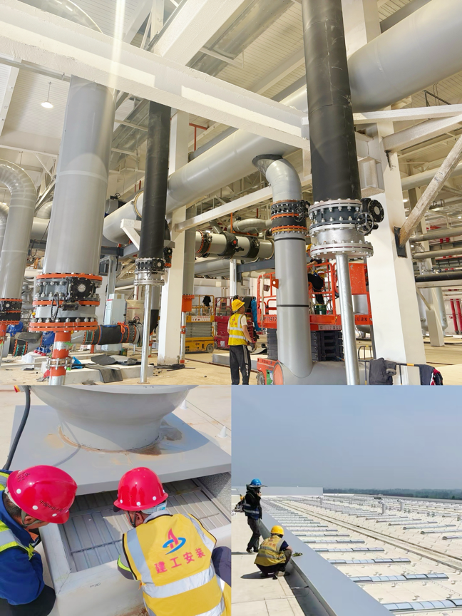 圖為新橋智能制造產(chǎn)業(yè)園項目部冷凍水管道保溫、屋面風(fēng)機調(diào)試、TPO屋面防雷接地施工